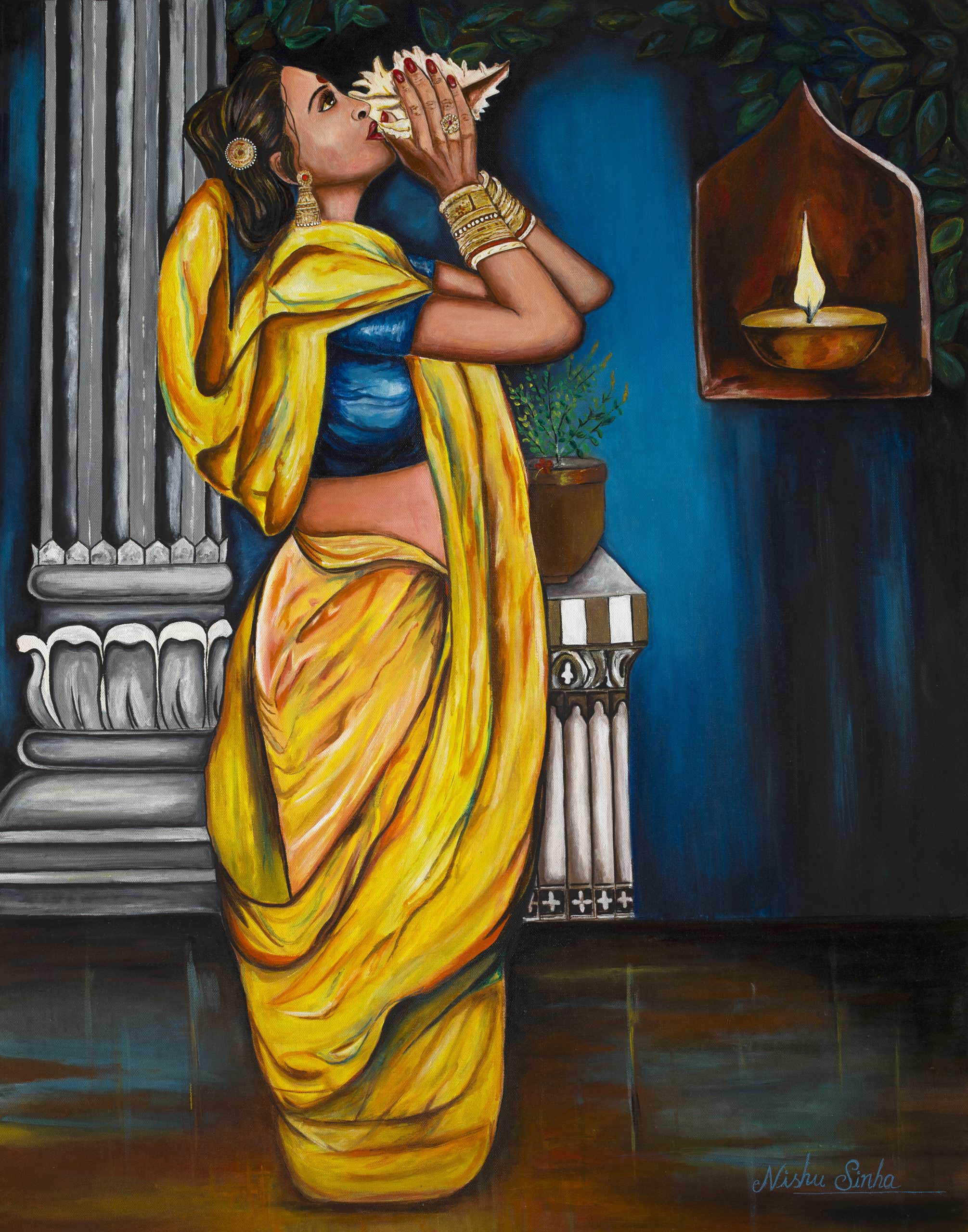 A moment of devotion, captured in colors. The conch, the lamp, the saree – symbols of tradition, grace and divine energy